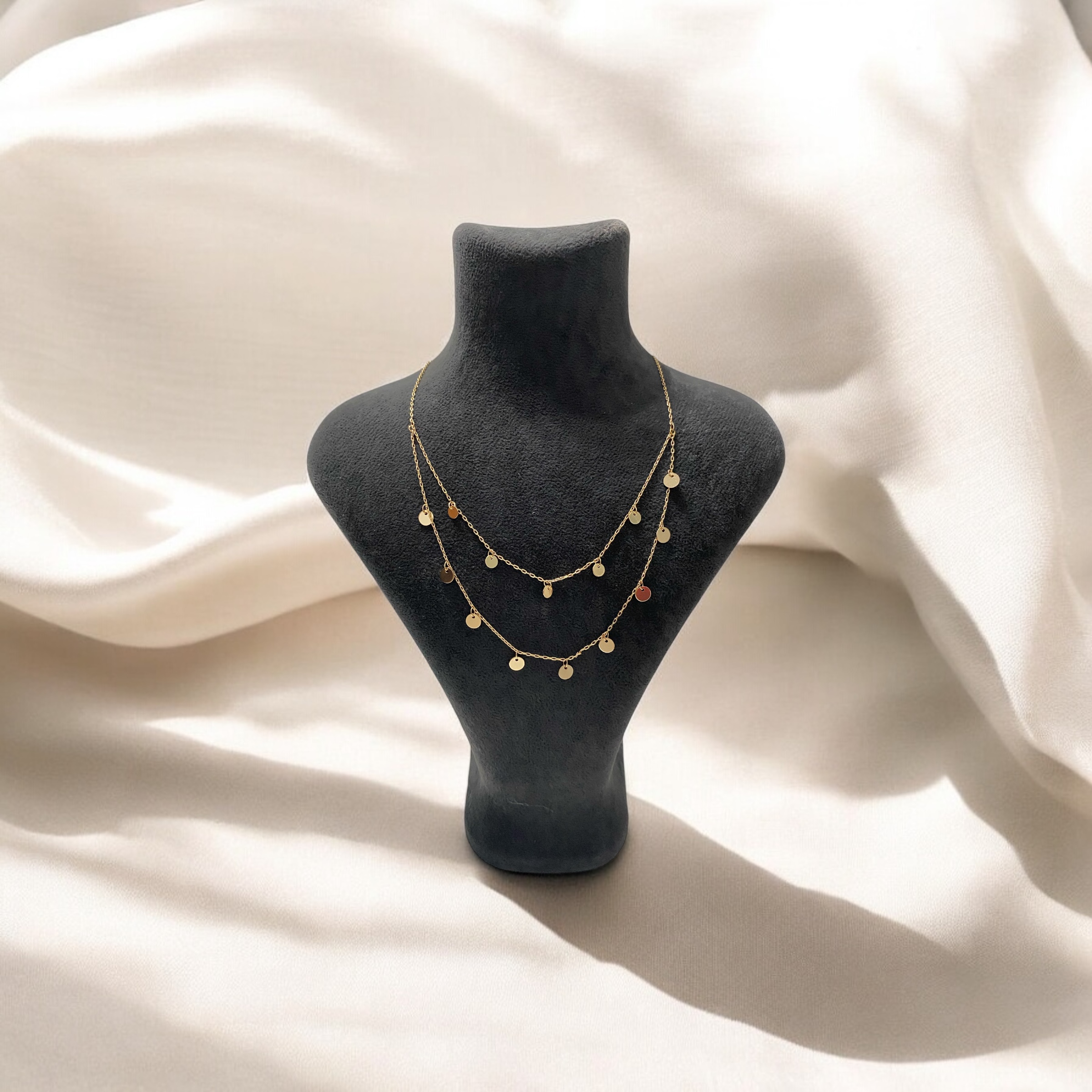Gökyüzündeki yıldızların eşsiz bir dansını hayatınıza getiriyor. Katmanlı tasarımıyla hareketi ve derinliği hissettirirken, minik altın diskler her adımınızda parıldayarak size göksel bir ışıltı sunar. Bu kolye sadece bir aksesuar değil, aynı zamanda kendi hikayenizi yazabileceğiniz bir zarafet dokunuşudur.
